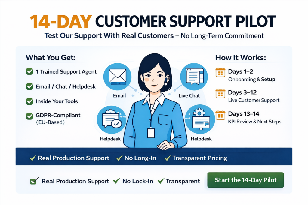 Our 14-day live support pilot lets you experience our service in real production before making a decision. We don’t offer demos or promises — we deliver real customer support, inside your systems, with your customers.